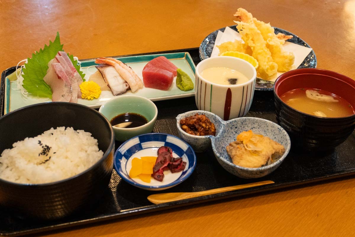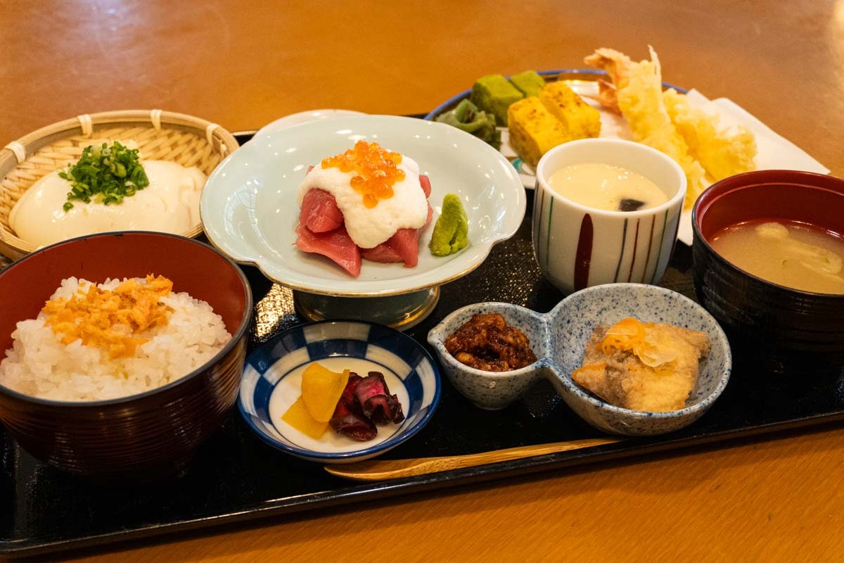 素材にこだわった出汁をベースに、素材重視の和食が堪能できる「食事処 谷屋」 広島赤鶏や向原卵、地元の山の幸や新鮮な魚介のお造りなどが楽しめ、 くつろぎの時間を彩ります